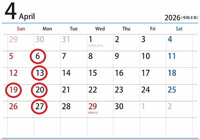 2026年4月の定休日